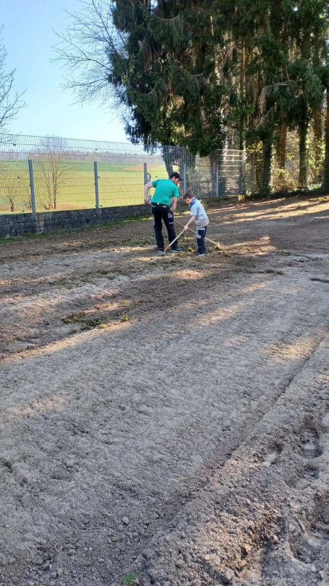 und im Spielplatz der Rasen ausgebessert.